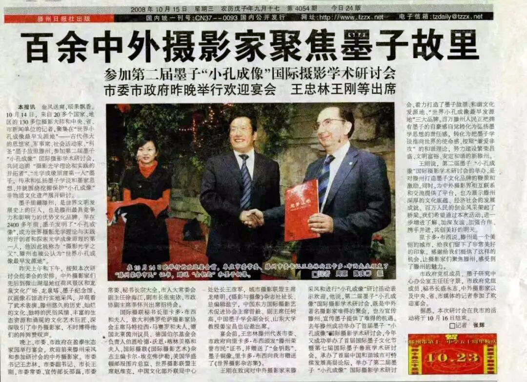 当年时任滕州市委书记的王忠林还亲自授予国际摄联主席布西滕州荣誉市民称号并颁发了金钥匙。前不久布西主席又一次以荣誉市民的身份回到滕州,率领各国摄影家再次走进滕州进行访问和拍照。如果博物馆落成后可以考虑同时与国际摄联共同创办“墨子国际摄影大展”或“墨子国际摄影周”,与济南国际摄影双年展融为一体,优势互补,共同发展。
