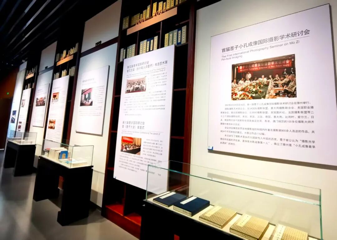 会谈结束后,在枣庄市墨子研究中心主任康凤霞等人的陪同下,曾毅教授一行先后参观了墨子纪念馆、鲁班纪念馆和滕州市博物馆。在参观过程中大家对墨子"兼爱""非攻"的伟大思想和"小孔成像"对人类的贡献表示无比的敬仰。尤其是曾毅教授在滕州市博物馆看到展示的两届"墨子小孔成像国际学术研讨会"图片和介绍时特别高兴,表示没有想到接近二十年前策划举办的一次活动,竟然永久的陈列在博物馆里,并留在历史的记忆和文献中。