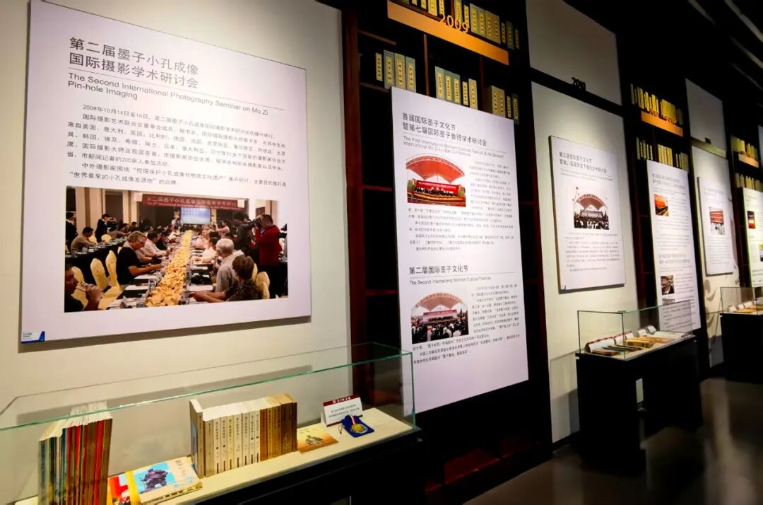 会谈结束后,在枣庄市墨子研究中心主任康凤霞等人的陪同下,曾毅教授一行先后参观了墨子纪念馆、鲁班纪念馆和滕州市博物馆。在参观过程中大家对墨子"兼爱""非攻"的伟大思想和"小孔成像"对人类的贡献表示无比的敬仰。尤其是曾毅教授在滕州市博物馆看到展示的两届"墨子小孔成像国际学术研讨会"图片和介绍时特别高兴,表示没有想到接近二十年前策划举办的一次活动,竟然永久的陈列在博物馆里,并留在历史的记忆和文献中。
