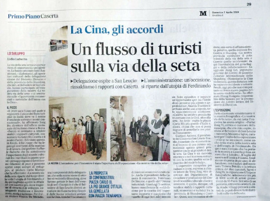 2019年4月6日中午,在中国文化和旅游部国际交流与合作局、中国驻意大利使馆文化处、中国驻罗马旅游办事处的大力支持下,历时近一年的倾力筹备,由中外文化交流中心与意大利卡塞塔市政府共同主办,东方国际摄影艺术促进会、山东省淄博市周村区人民政府、圣莱乌乔观景台王宫丝绸博物馆、卡塞塔工业联合会和卡塞塔商会联合承办,山东国际文化交流中心和上海市徐汇区文化局协办的“我们的丝路:中外摄影艺术精品展”,在意大利卡塞塔圣莱乌乔观景台王宫丝绸博物馆隆重开幕。